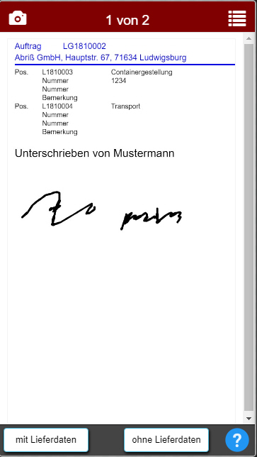 Tippen sie auf den Button „mit Lieferschein“, um die Unterschrift mit den Lieferscheindaten im Hintergrund zu erfassen. Wollen sie keine Lieferscheindaten eingeblendet bekommen, tippen sie auf „ohne Lieferschein“.